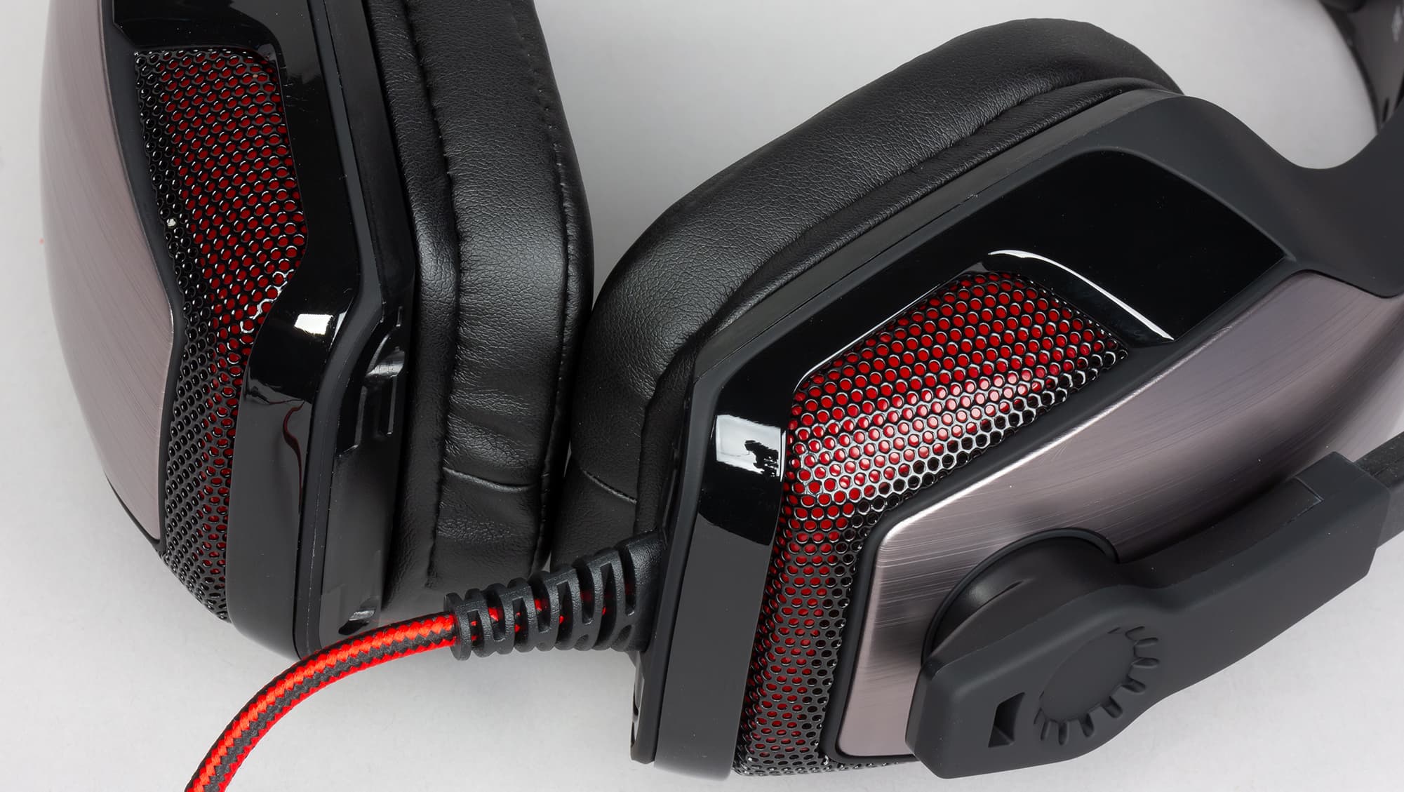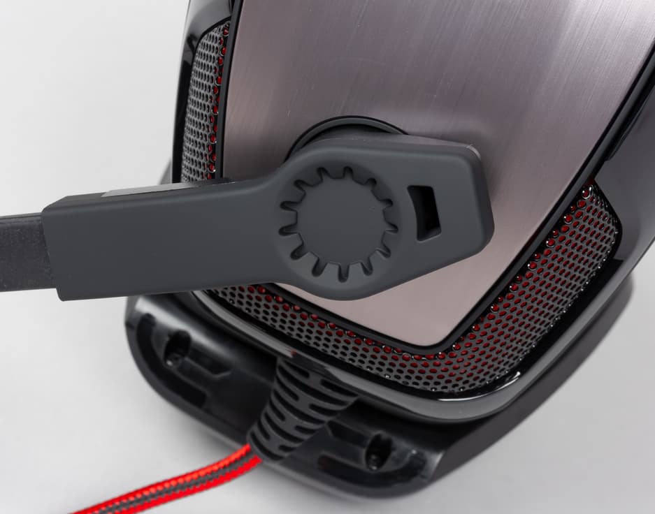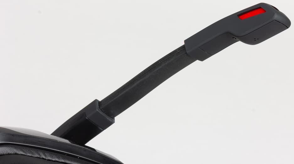 К левой чашке крепится несъёмный микрофон на массивной гибкой ножке, хорошо запоминающей положение в пространстве. Крепление позволяет поднимать и опускать микрофон в случае надобности. Ножка прокручивается с ощутимым усилием, что практически исключает случайное изменение положения.