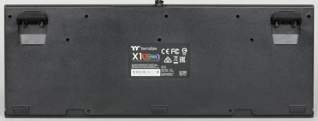 На днище клавиатуры есть прорезиненные пластины, препятствующие скольжению по поверхности стола. Две откидные ножки позволяют изменить угол наклона относительно стола.