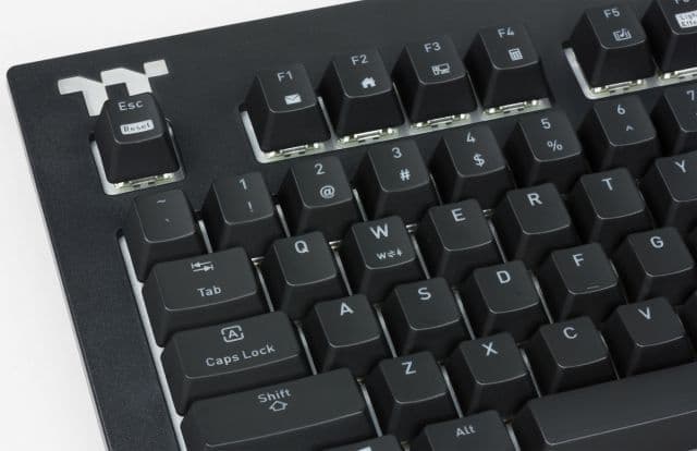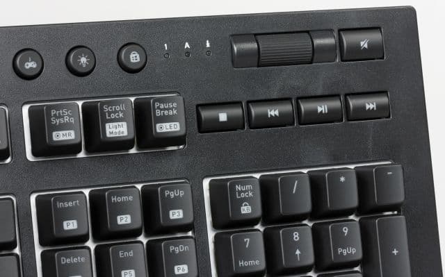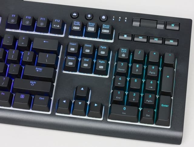 Переключатели Cherry MX Blue оснащены встроенным светодиодом, который смещён к верхнему краю колпачка. Поэтому выгравированные символы также смещены к верхнему краю колпачков, чтобы обеспечить лучшую подсветку. На тесте у нас был экземпляр без символов кириллицы, но можно предположить, что при гравировке они будут подсвечиваться хуже, так как будут расположены дальше от светодиодов.