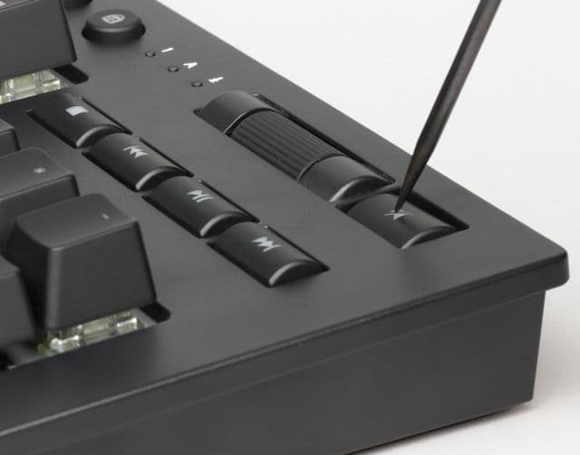 В правом верхнем углу клавиатуры размещены клавиши для управления системным медиаплеером и цилиндр для регулировки уровня громкости. Отметим, что такой способ управления звуком наиболее естественный, а значит удобный.