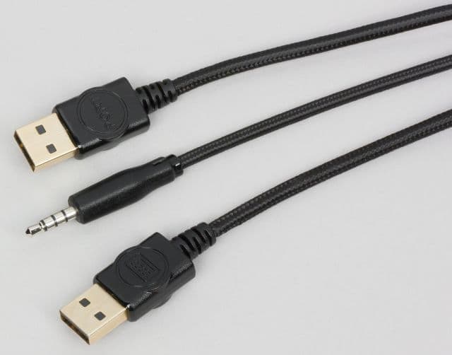 В клавиатуру встроено сразу три интерфейсных кабеля в текстильной оплётке: два со штекерами USB и один с миниджек. Это позволяет подключать наушники непосредственно к клавиатуре и использовать встроенный порт USB для подключения, например, мышки. Конструкция с тремя штекерами выглядит массивно, а встроенный кабель получился толстым и довольно неудобным в обращении. Удобство же подключения наушников непосредственно к клавиатуре вызывает вопросы, так как в играх чаще используют гарнитуру, а для такого варианта подключения потребуется специальный разветвитель, не входящий в комплект, чтобы подключить кабель от клавиатуры к линейному выходу и входу для микрофона звуковой карты ПК. Совершенно необязательно, что такой разветвитель есть в комплекте с гарнитурой, которая уже имеется у пользователя. Сквозной порт USB 2.0 удобен, ведь к нему можно подключать различную периферию, например мышь.