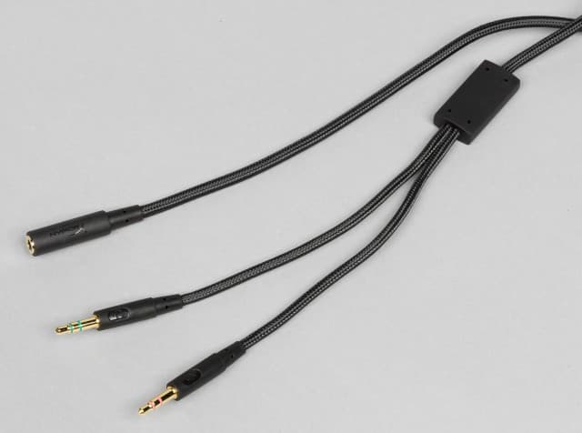 Если вам требуется работа с игровым компьютером, оборудованным раздельными выходом для наушников и входом для микрофона, то нужно будет воспользоваться комплектным удлинителем-адаптером. Этот кабель по внешнему и конструкции виду аналогичен основному. Никаких органов локального управления на нём тоже нет. Его длина составляет два метра. Так что, скорее всего, придётся использовать какие-то стяжки для вкручивания избыточной части. Их производитель, к сожалению, тоже не предусмотрел в комплекте поставки. Заканчивается этот кабель двумя стандартными миниджеками. Отметим, что все разъёмы имеют тонкие корпуса из резины. Для идентификации на них есть значки и цветовая маркировка.