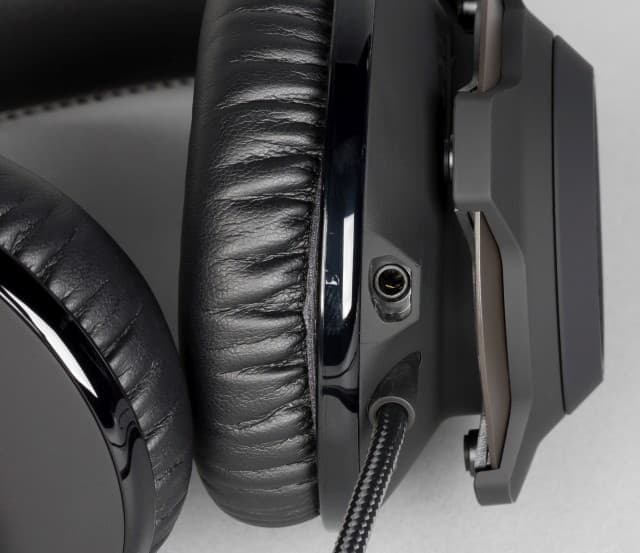 На левой же чашке находится выход основного аудиокабеля. Он несъёмный, а от поломки немного защищён упругой втулкой. Толщина кабеля почти четыре миллиметра. Он имеет чёрную тканевую оплетку, в меру мягкий и не склонен к запутыванию.