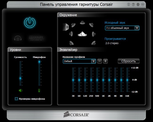 В программе для настройки звука были просто переставлены блоки, и даже ссылка под знаком вопроса всё еще указывает на уже несуществующую страницу по Vengeance 2000. Список настроек совсем невелик: эквалайзер, громкость и переключение между стерео, виртуальным 5.1 или 7.1 звуком (для чего используется технология Dolby Pro Logic IIx).