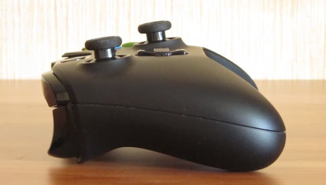 Кнопки и стики находятся на привычных по контроллеру для Xbox 360 местах. В глаза бросаются утолстившиеся триггеры и бамперы, что объясняется вмонтированными вибромоторчиками. Бамперы нажимаются туго, со щелчком. Пластик корпуса тонкий, шершавый, контроллер надежно и комфортно лежит в руках.