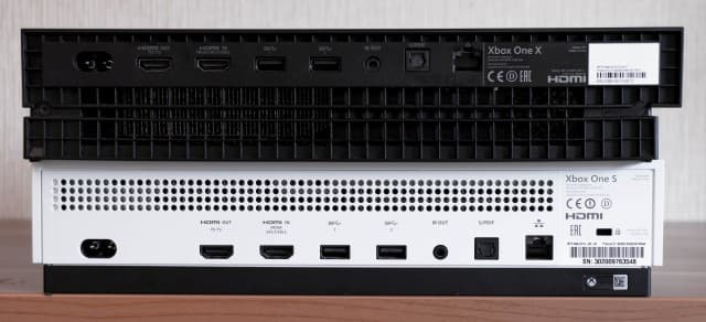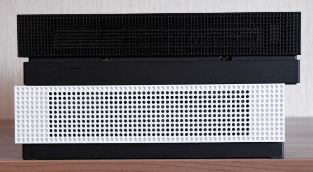 Задняя грань: Xbox One X сверху, Xbox One S снизу